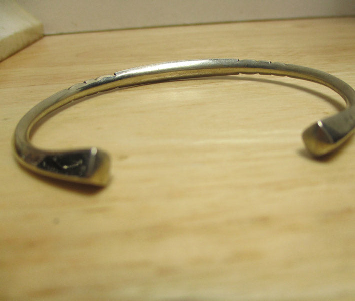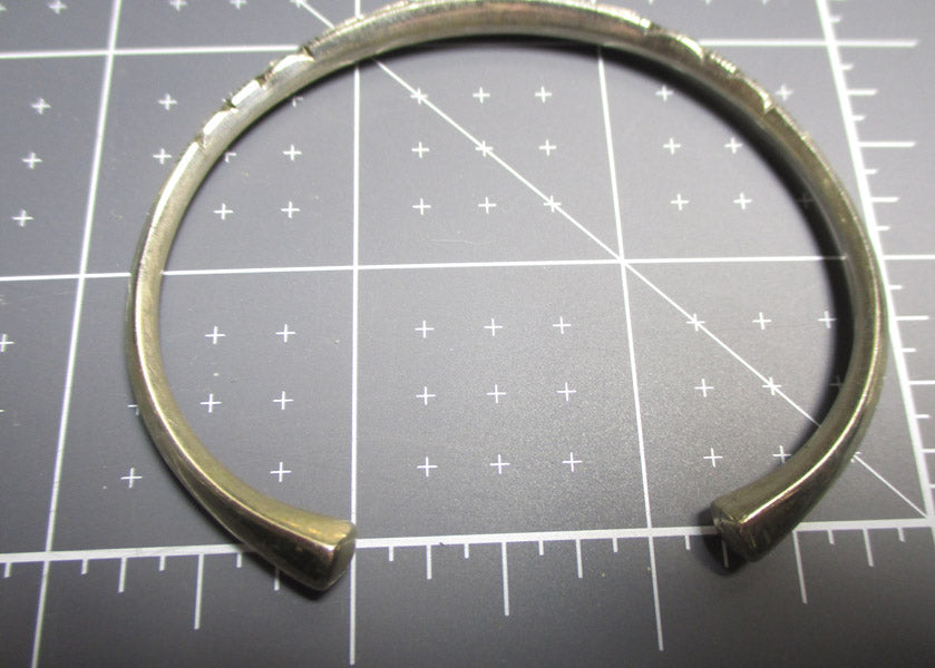 Simple tribal hand stamped carinated ingot sterling silver cuff bracelet. This is an earlier piece and in excellent condition and a nice, detailed style. It measures 2 1/2" maximum width and has a 1 1/4" opening. This fits a 7 1/4" wrist at the most.